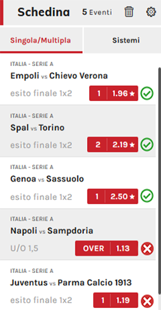 Giocata con bonus sport                                                                        Giocata errata con 2 eventi sotto quota 1.30.